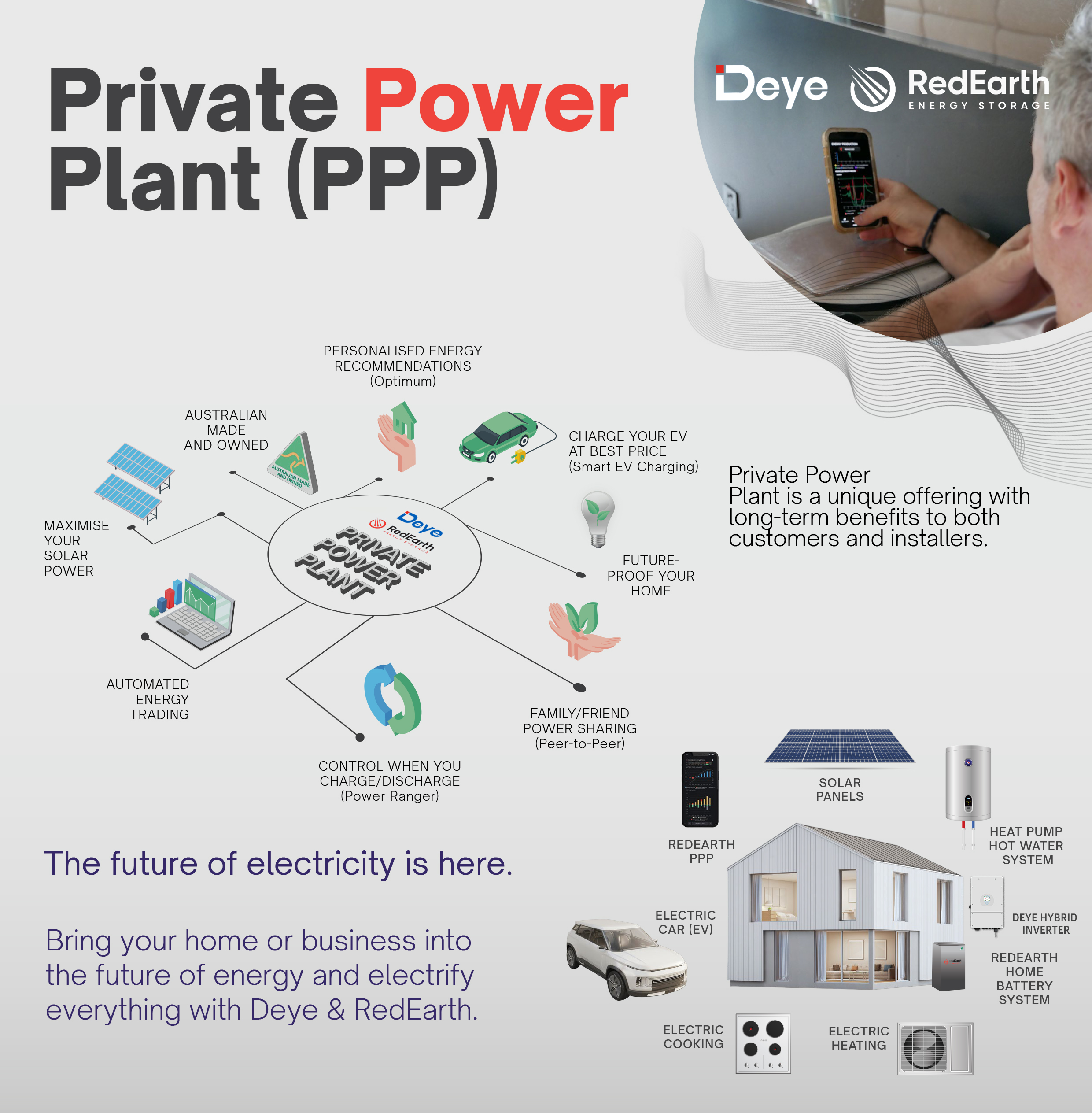 Gama hybrydowych falowników Deye'a jest specjalnie certyfikowana na rynek australijski i jest dostępny w rozmiarach od 5 do 50 kW, a więcej modeli jest certyfikowanych w 2024 roku. Te falowniki są teraz dostępne jako certyfikowane falowniki PPPP z uwzględnieniem platformy oprogramowania Redearth. PPP Redearth maksymalizuje zwrot dostępny w systemach akumulatorów dla klientów na rynku australijskim i południowo -południowym. PPP Redearth to platforma, która zapewnia właściciele Deye Inverter zautomatyzowane dynamiczne zarządzanie energią słoneczną w zakresie handlu energią, udostępnianie energii peer-to-peer i dynamiczne opcje ładowania EV. Interfejs użytkownika obejmuje aplikację EMU Pracowana i zastrzeżone EMS (system zarządzania energią) w celu uzyskania bardziej złożonych instalacji.