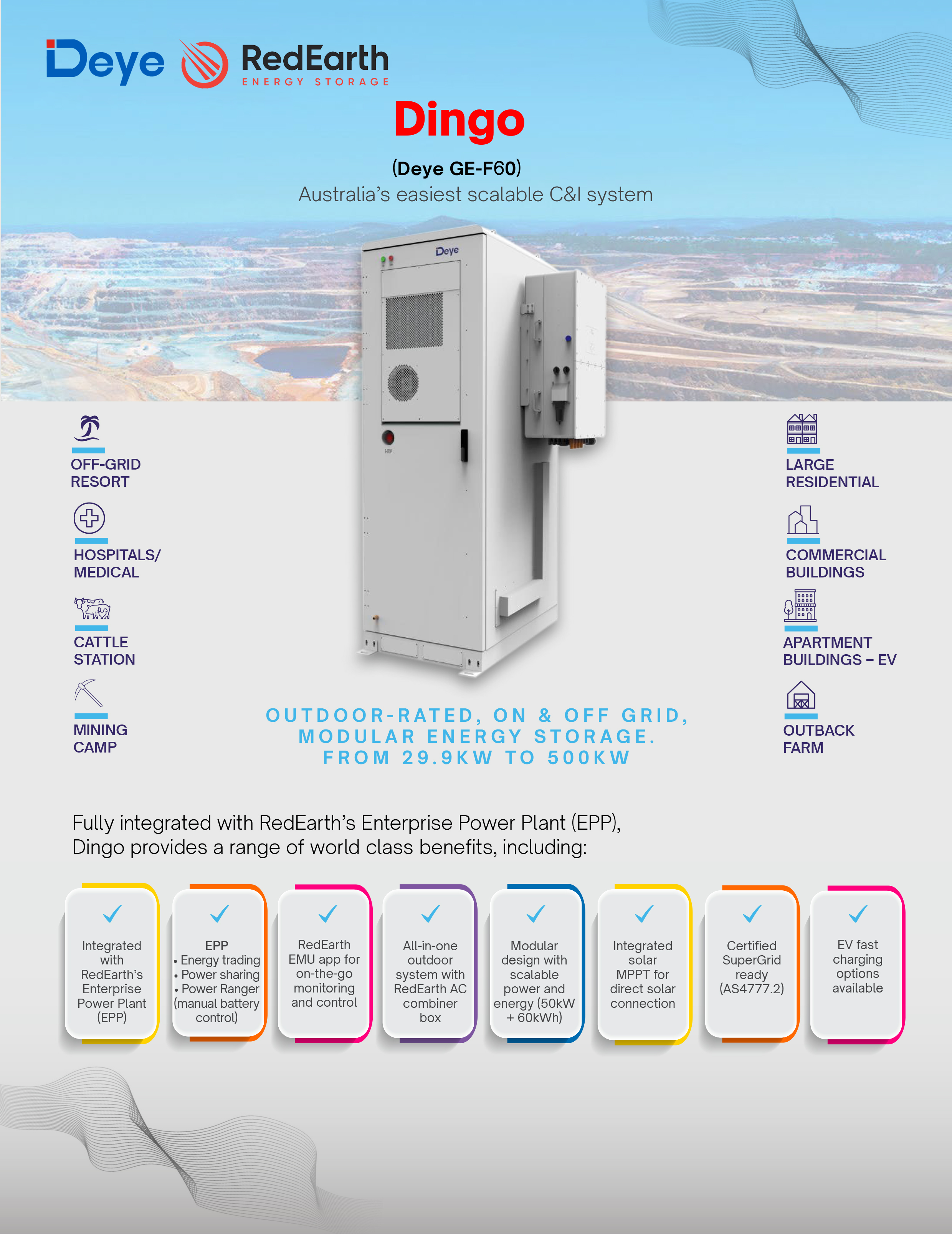 Ponadto falowniki Deye mogą być grupowane równolegle, aby zaspokoić zapotrzebowanie rynku na skalowalną moc, co czyni go jednym z bardziej wielofunkcyjnych hybrydowych falowników na rynku australijskim. Ponownie, oprogramowanie PPP Redeartha zostało zaprojektowane tak, aby w pełni wykorzystać tę skalowalność. Nawet złożone instalacje można zarządzać, dodając wewnętrzne opracowane EMS Redearth (system zarządzania energią) działającą w połączeniu z nową platformą chmurową Deye.