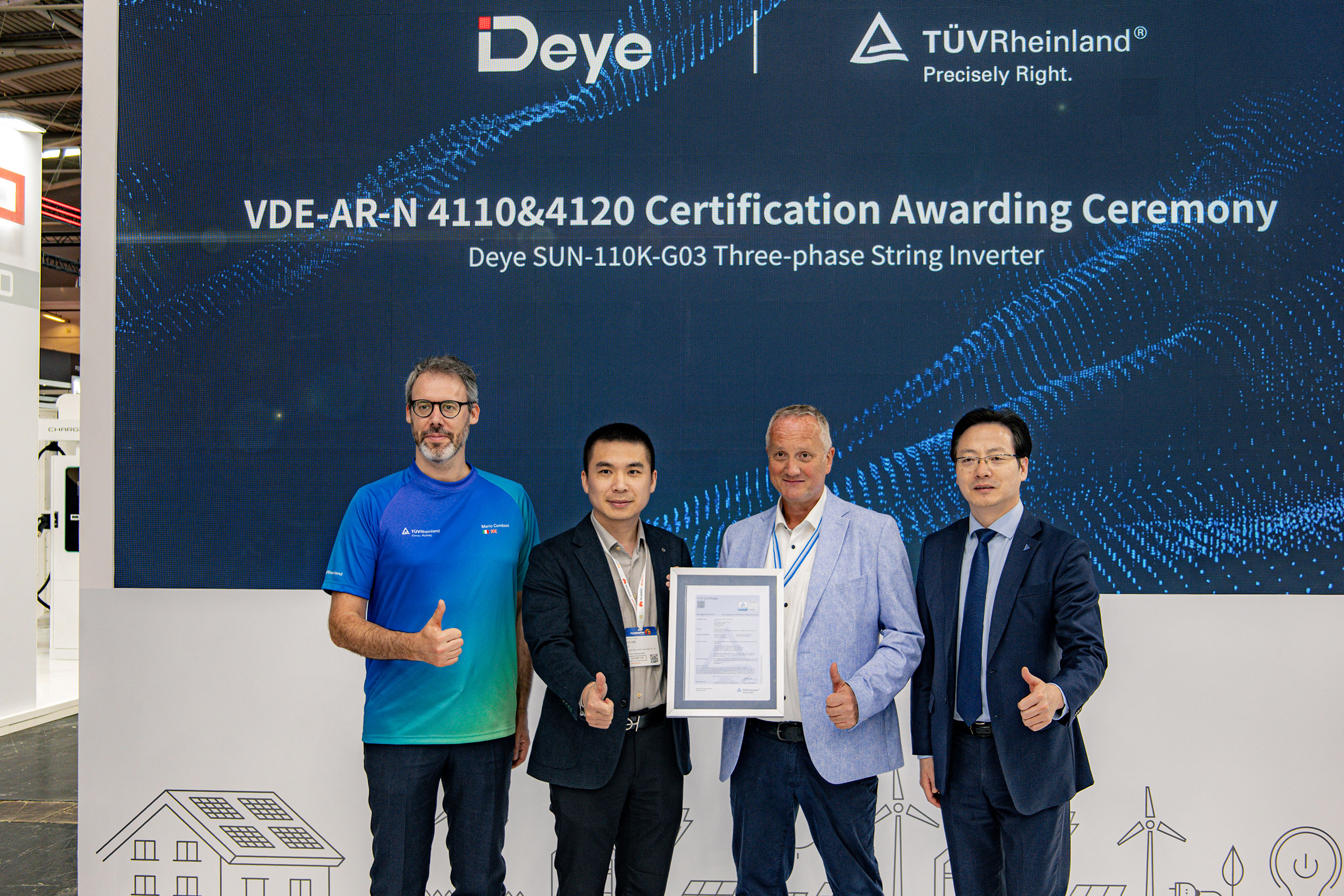 7 maja Międzynarodowy Urząd Testów, Inspekcji i Certyfikacji, Tüv Rheinland, przyznał trójfazowy falownik o 110 kW VDE-AR-N 4110 i 4120 Certyfikaty, walidacja jego zgodność z przekonywający Niemieckie standardy połączenia o średnim napięciu i wysokim napięciu. Zobowiązanie Deye w bezpieczeństwo i niezawodność zostało Domalnie rozpoznane Ponownie. Ten falownik jest zoptymalizowany pod kątem komercyjnych dachów i montowanych systemów fotowoltaicznych.