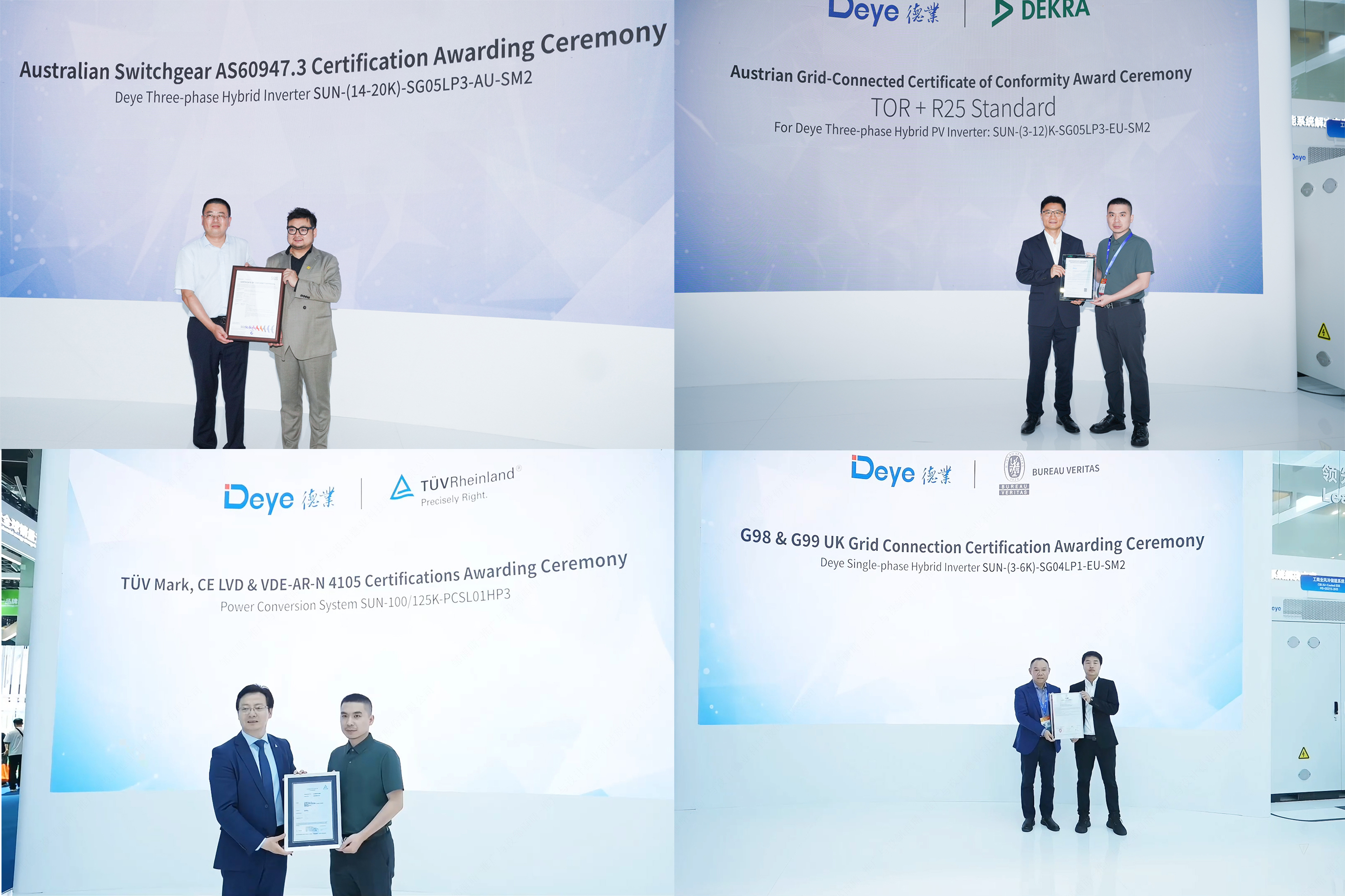 W dniach 11-12 czerwca wiodące międzynarodowe organy certyfikacyjne-Tüv Rheinland, Bureau Veritas, Dekra i SGS-wypowiedziały wiele produktów Deye z certyfikatami bezpieczeństwa dla Niemiec, Wielkiej Brytanii, Austrii i Australii. Ten kamień milowy podkreśla globalną konkurencyjność Deye i niezachwiane zaangażowanie w jakość i zadowolenie klientów.